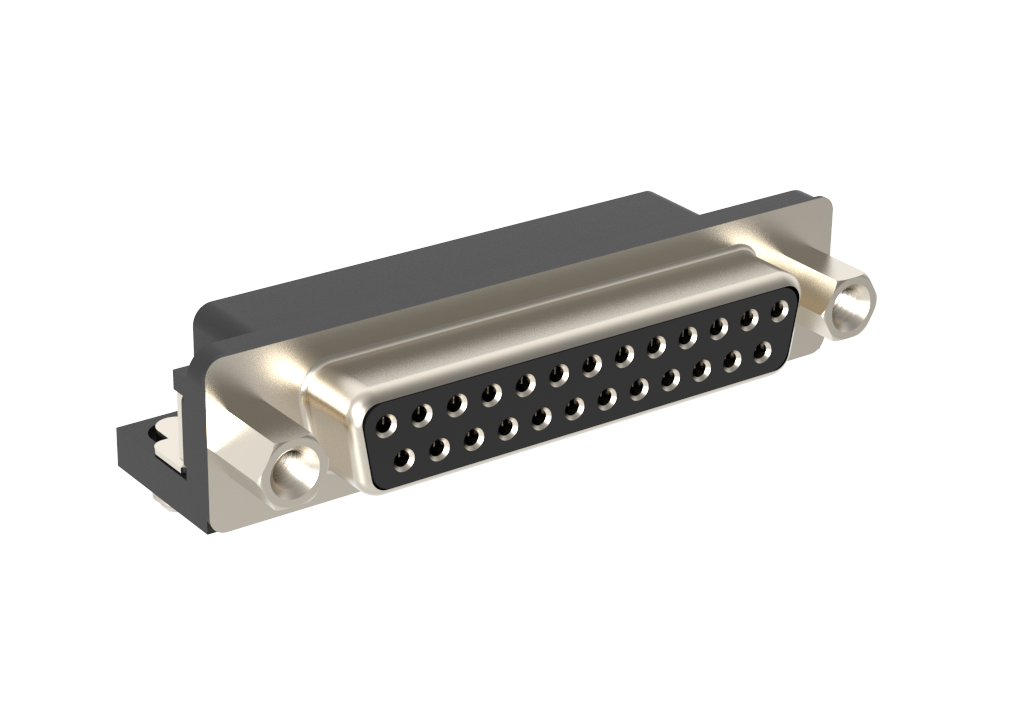 Dsub, Stamped Signal 3A, Right Angle PCB Thru Hole, High Temp Std Density, FP=8.08mm (.318in), 25 Socket, Bright Tin Shell, Flash Gold, M3 Removable Front Screwlock, Ground Tab& Boardlock, Plastic Tray, Closed Back