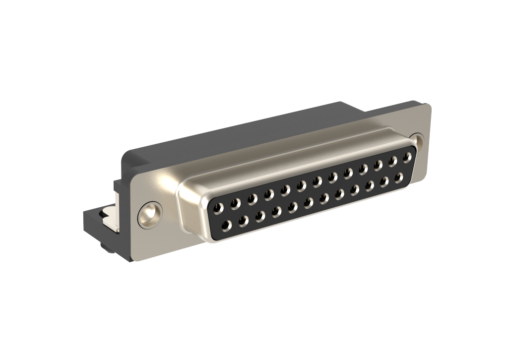 Dsub, Stamped Signal 3A, Right Angle PCB Thru Hole, Hight Temp Std Density, FP=8.08mm(0.318in), 25 Socket, Bright Tin Shell, 0.76m (30 in) Gold, M3 Rear Insert, Ground Tab&Boardlock, Tape & Reel, Close Back