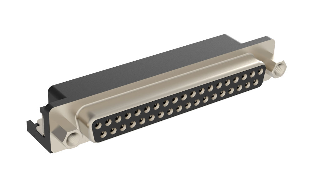 Dsub, Stamped Signal 3A, Right Angle PCB Thru Hole, High Temp Std Density, FP=8.08mm (.318in), 37 Socket, Bright Tin Shell, 0.38μm (15μin) Gold, M3 Removable Front Screwlock, Ground Tab& Boardlock, Plastic Tray, Closed Back