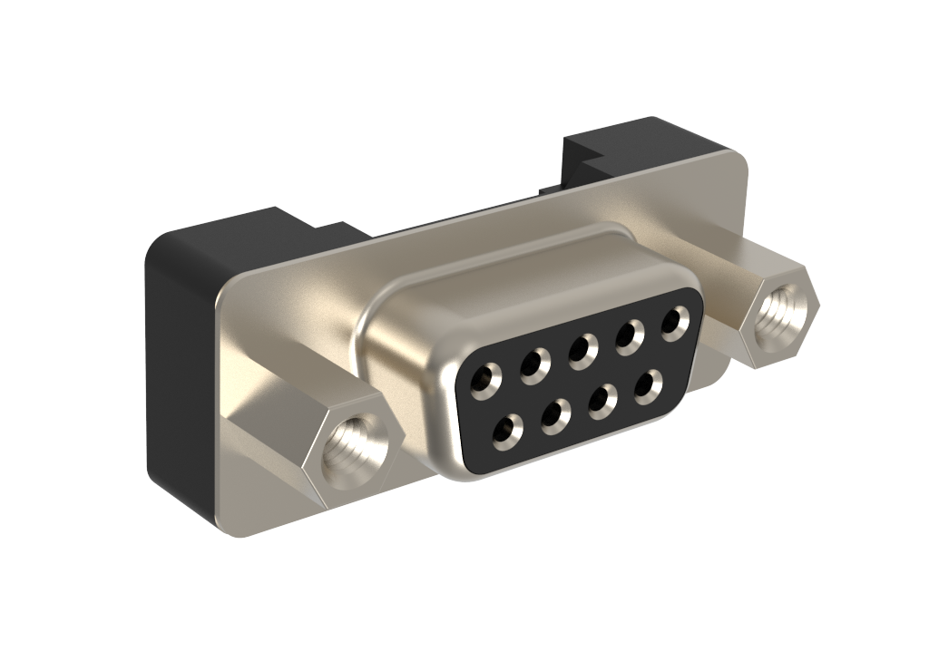 Dsub, Stamped Signal 3A, Straight PCB Thru Hole, High Temp Std Density, H=6.02mm (.237in), 09 Socket, Bright Tin Shell, Flash Gold, M3 Removable Front Screwlock, M3 Threaded Boardlock, Plastic Tray