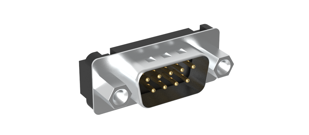 Dsub, Stamped Signal 3A, Straight PCB Thru Hole, High Temp Std Density, H=6.02mm (0.237in), 09 Pin, Bright Tin Shell+Grounding Dimples, Flash Gold, 4-40 Removable Front Screwlock, 4-40 Threaded Boardlock, Plastic Tray