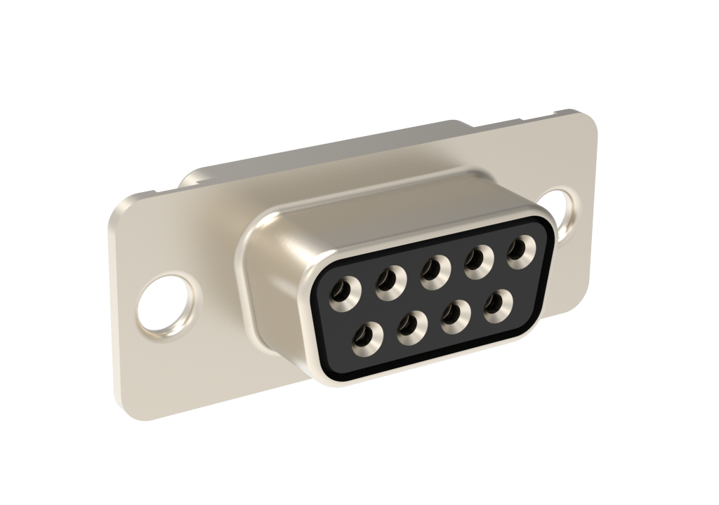 Dsub, Machined Pin 7.5A, Straight PCB Thru Hole, Cnt Length=3.2mm (0.126in), Cnt =0.6mm (0.024in), 09 Socket, Bright Tin Shell, Flash Gold, 3.1mm (0.122in) Clear Hole, Without Standoff&Boardlock.