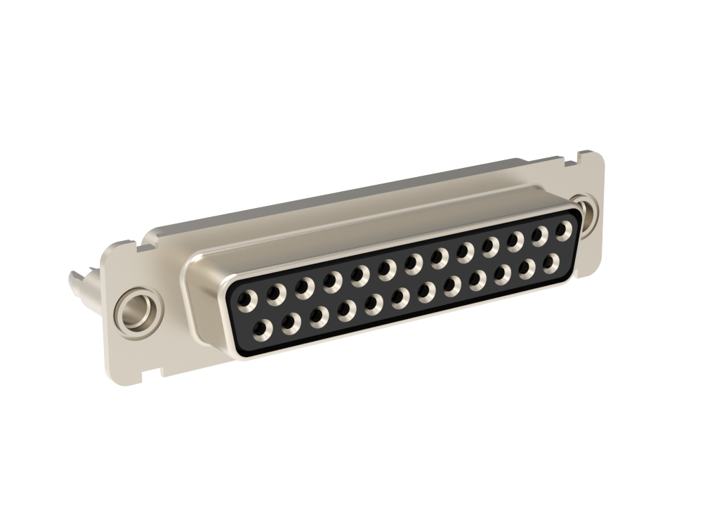 Dsub, Machined signal 7.5A, Straight PCB Thru Hole, Cnt Length=5.5mm (.217in), Cnt =0.6mm (.024in), 25 Socket, Bright Tin Shell, 0.38μm (15μin) Gold, M3 Standoff With Boardlock.