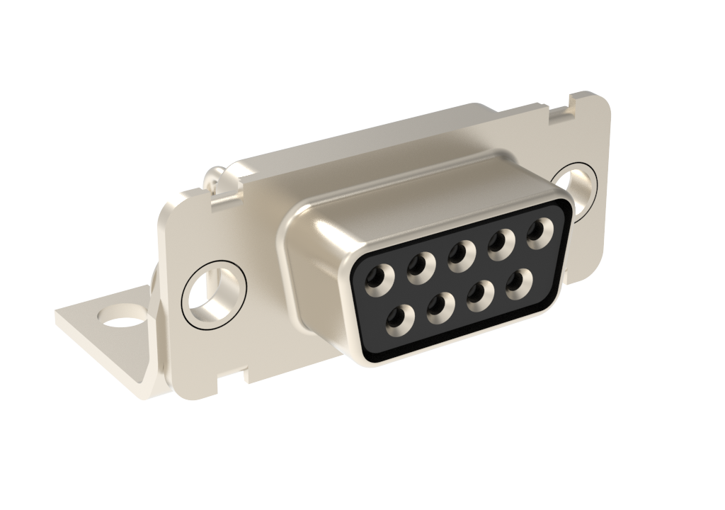 Dsub, Machined signal 7.5A, Right Angle PCB Thru Hole, FP=10.3mm, Cnt Row Spacing 2.54mm, Cnt Tail 0.6mm, 09 Socket, Bright Tin Shell, 0.38m (15 in) Gold, 3.1mm (0.122 in) Clear Hole, Metal R/A Bracket Without Boardlock