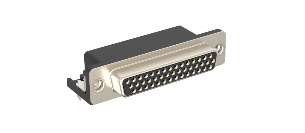 Dsub, Stamped Signal 3A, High Density, Right Angle PCB Through Hole, FP=8.89mm (0.35μin), 44 Socket, Bright Tin Shell, Flash Gold, 4-40 Rear Insert, Ground Tab with Boardlock