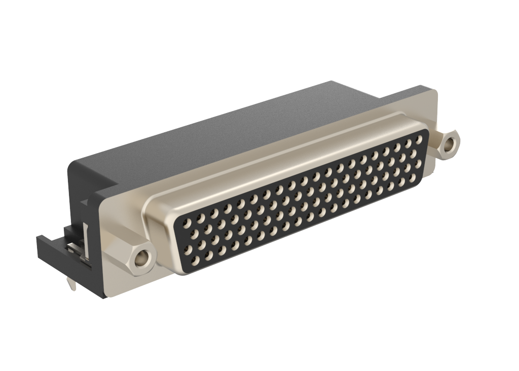 Dsub, Stamped Signal 3A, High Density, Right Angle PCB Through Hole, FP=8.89mm (0.35μin), 78 Socket, Bright Tin Shell, Flash Gold, 4-40 Removable Front Screwlock, Ground Tab with Boardlock