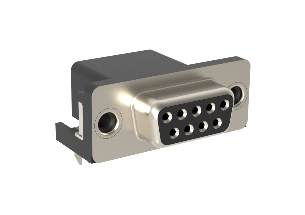 Dsub, Stamped Signal 3A, Right Angle PCB Through Hole, FP=14.84mm (0.584in), Row Pitch 2.84mm, 09 Socket, Flash Gold, Bright Tin Shell, 4-40 Rear Insert, Ground Tab with Boardlock