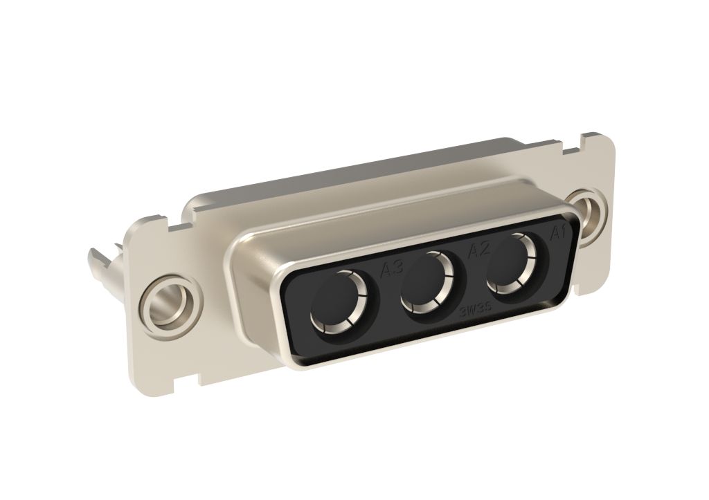 Dsub, Machined Hybrid, 3W3, Power (20A) Contacts Only, Socket, Straight PCB Thru Hole, Bright Tin Shell, 0.38m (15 in) Power, M3 Threaded Standoff (Panel Side) with Boardlock