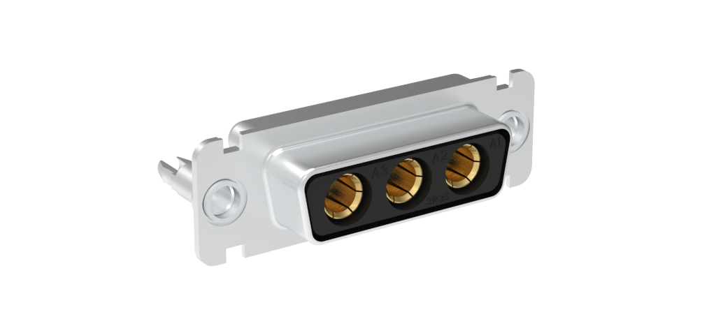 Dsub, Machined Hybrid, 3W3, Power (40A) Contacts Only, Socket, Straight PCB Thru Hole, Bright Tin Shell, 0.38m (15 in) Power, 4-40 Threaded Standoff (Panel Side) with Boardlock