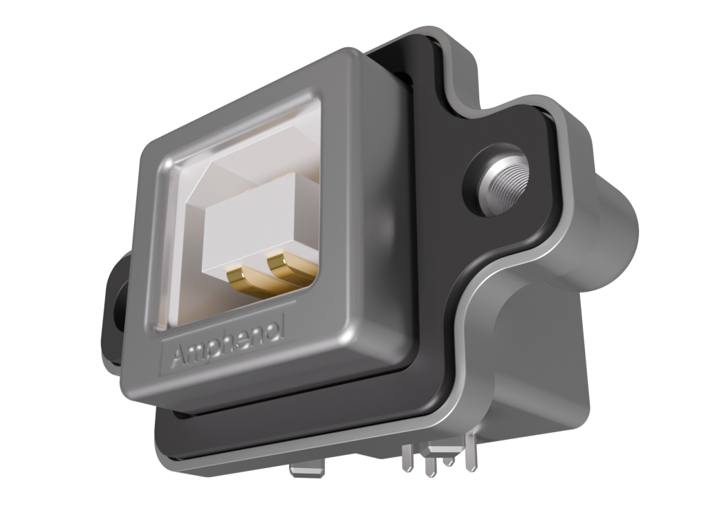 Rugged USB 2.0, Input Output Connector, Standard B series, Right Angle on PCB, 4 Position, With Rear Shield, MetricThread, Grey dust cover