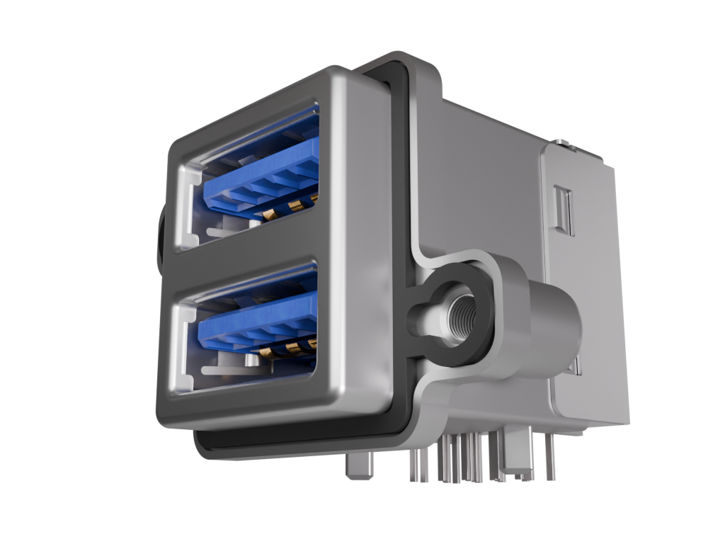 Rugged USB 3.0, Input Output Connector, IP67, Stacked, Right Angle on PCB, 9 Position per port for USB Type A, Metric Thread. No Dust Cover