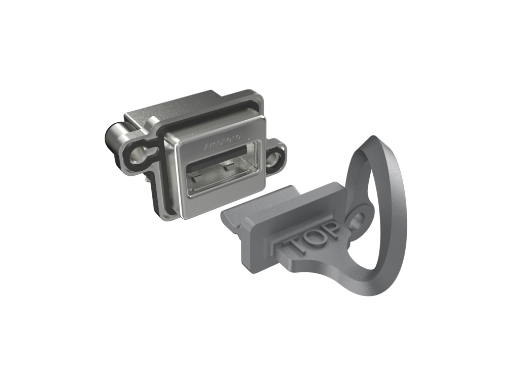 Rugged USB 2.0, Input Output Connector, IP67, Right Angle on PCB, 4 Position per port for USB Type A, Standard Shell for Type A, Metric Thread, with Grey dust cover