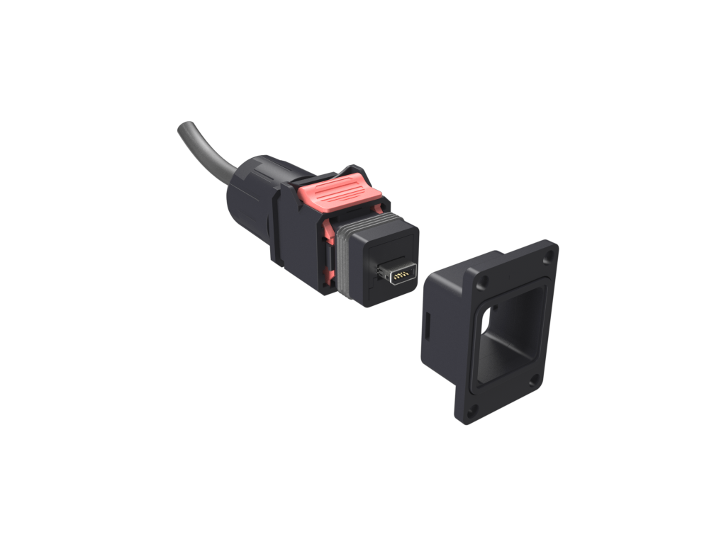 Rectangular Push Pull IP67 Industrial Ethernet Cable Assembly, NDH, Ix Industrial, Bulkhead, Hood + Cable Assembly, Ix A Key on one end and Pigtail on other end, 30μin Pd Ni with Gold flash plating Gold plating, 0.5m