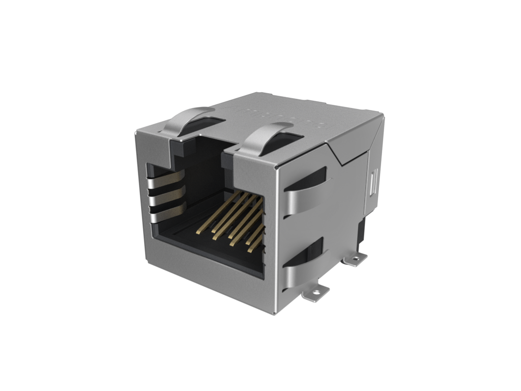 Modular Jack – 8P8C, Right Angle, CAT6, Surface Mount, Single Port, Shield With Top and Side EMI Tabs, With Housing Pegs, No LEDs