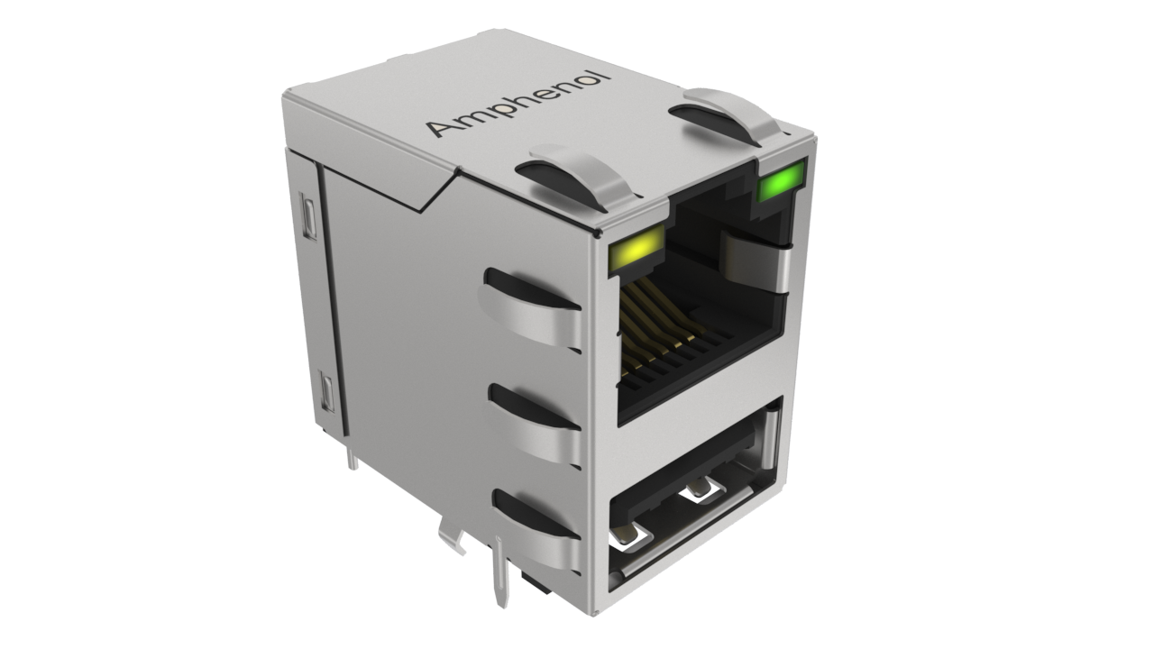 Stacked CAT5E RJ45 + USBA 3.2 Gen2 with Shield and EMI Tabs , With LED