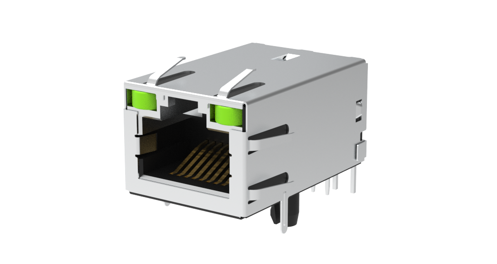 RJ Magnetic (RJMG) – 1×1, Input Output Connectors, Right angle, dip type. 1×1, 10/100 base-T. Green/Yellow