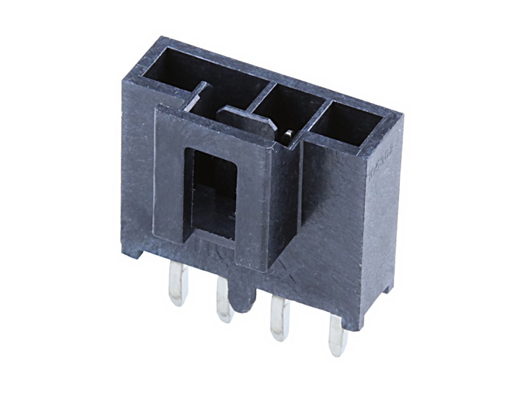 Nano-Fit Vertical Header, Through Hole, 2.50mm Pitch, Single Row, 4 Circuits, with Kinked Pins, Tin (Sn) Plating, Black, Glow-Wire Capable, Tray
