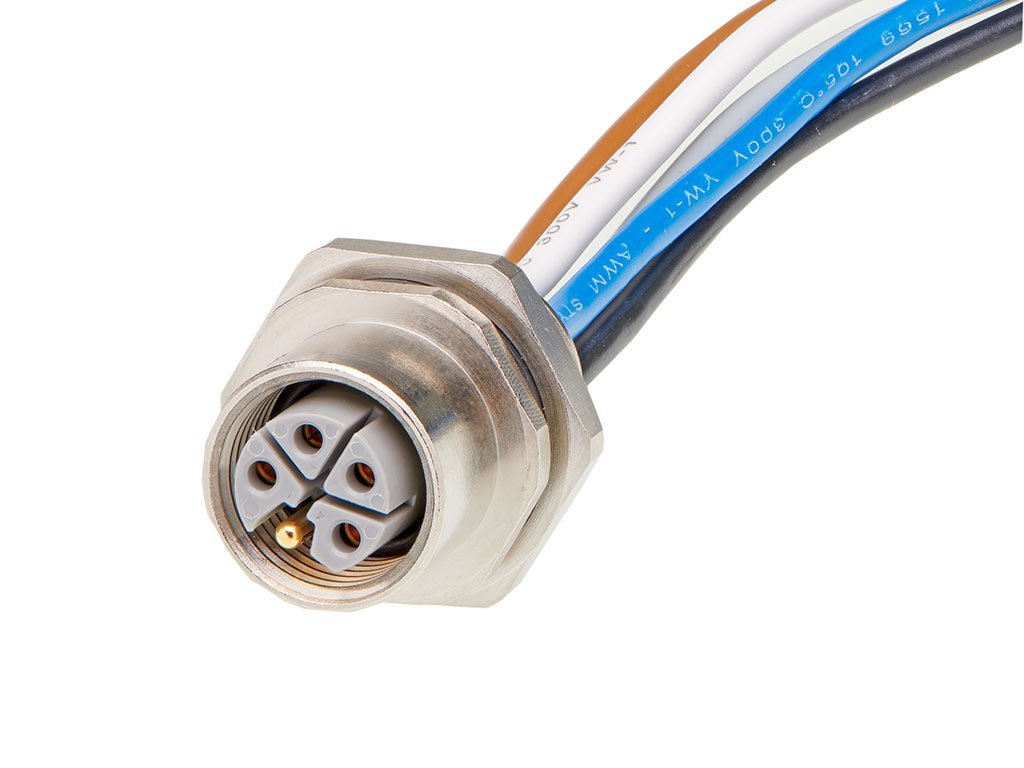 Micro-Change (M12) Receptacle, 5 Poles, L-Coded, M16x1.5 Threads, Female (Straight) to Leads, 0.50m (1.64′) Length, 1.50mm² Wire, Front Panel Mount