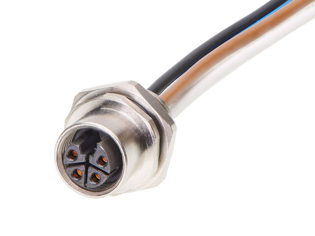 Micro-Change (M12) Receptacle, 4 Poles, L-Coded, M16x1.5 Threads, Female (Straight) to Leads, 0.20m (7.87″) Length, 1.50mm² Wire, Front Panel Mount
