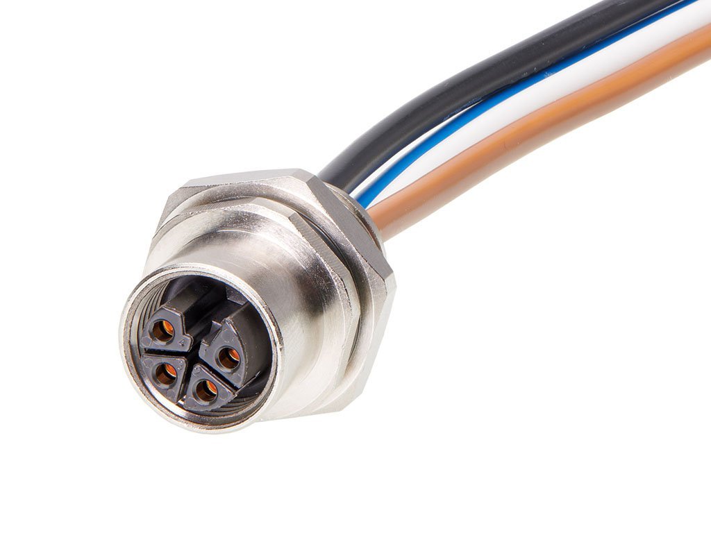 Micro-Change (M12) Receptacle, 4 Poles, L-Coded, M16x1.5 Threads, Female (Straight) to Leads, 0.50m (1.64′) Length, 2.50mm² Wire, Front Panel Mount