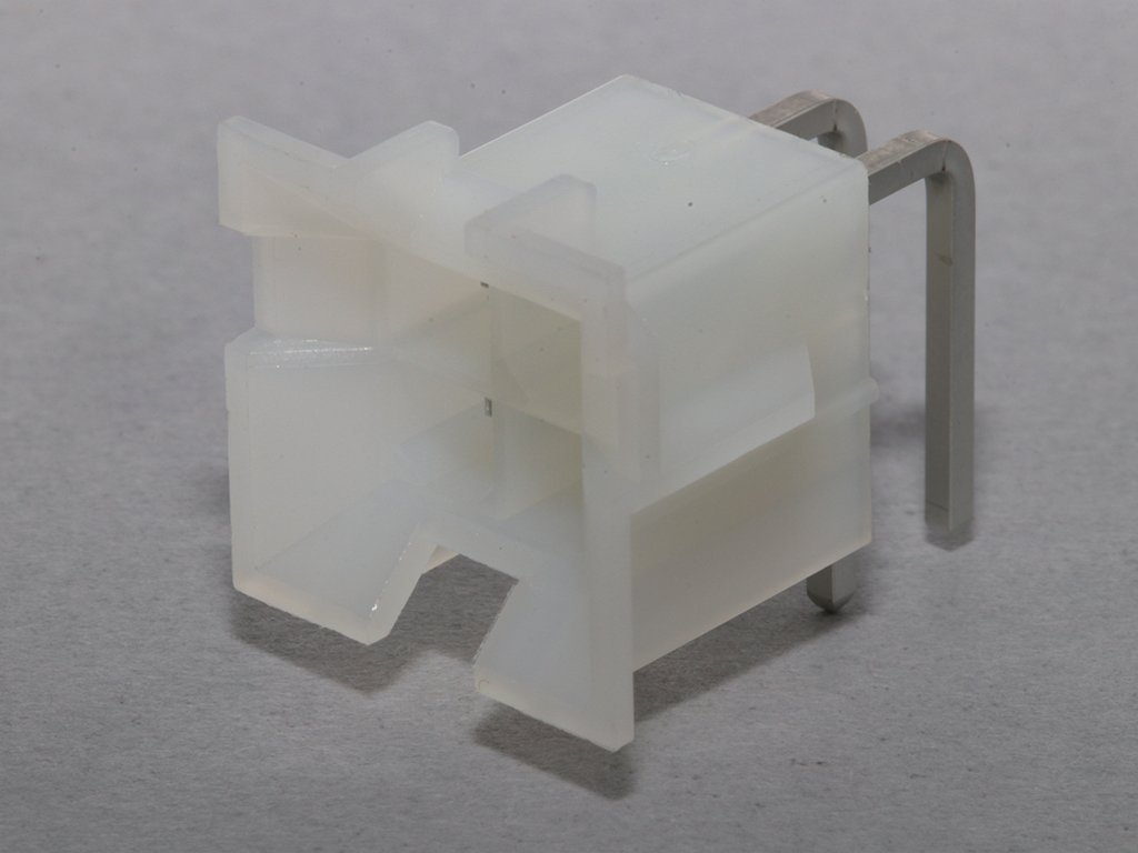 Mini-Fit BMI Header, Dual Row, Right-Angle, with Snap-in Plastic Peg PCB Lock, 4 Circuits, PA Polyamide Nylon 6/6, UL 94V-2, with Select Gold (Au) Plating