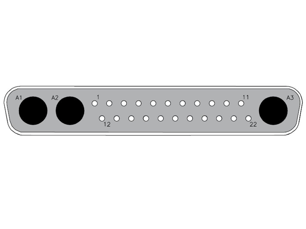 FCT Mixed Layout D-Sub Connector, Female, Straight, Solder Cup, Gold over Nickel Phosphorus Plating, Tin-plated Shell, 25 Circuits Max, 22 Signal Contacts Loaded, Green Insulator