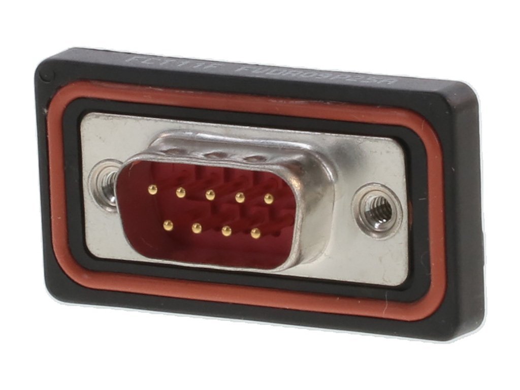 FCT Standard-Density Waterproof D-Sub Connector, Male, Right-Angle, PCB Through Hole, 10.50mm Tail Length, Gold over Nickel Phosphorus Plating, Plastic Watertight Frame, Snap-in Bolt, 9 Circuits, Red Insulator