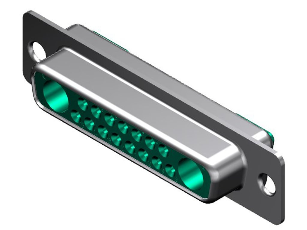 FCT Mixed Layout D-Sub Connector, Female, Straight, Solder Cup, Gold Plating, Tin-plated Shell, 17 Circuits Max, 15 Signal Contacts Loaded, Green Insulator