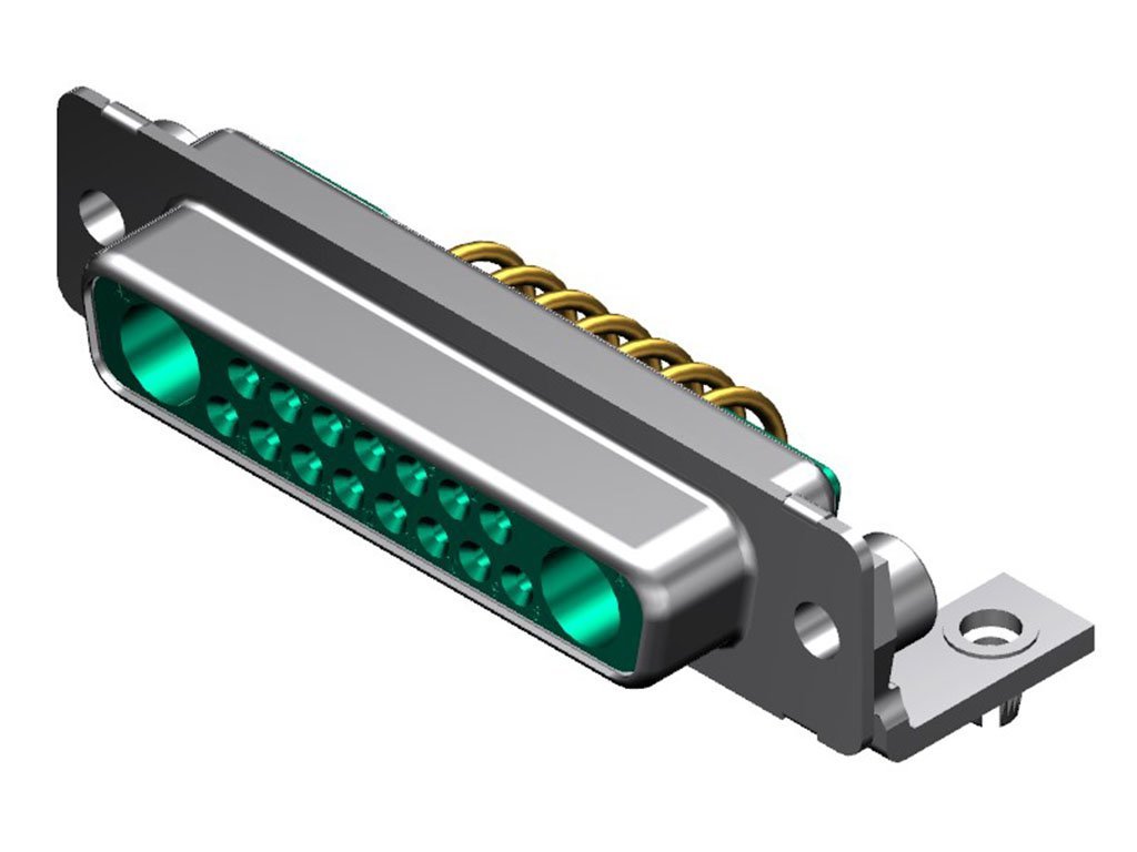 FCT Mixed Layout D-Sub Connector, Female, Right-Angle, PCB Through Hole, Gold Plating, Tin-plated Shell, 14.50mm Riveted Metal Bracket and #4-40 Clinch Nut, 17 Circuits Max, 15 Signal Contacts Loaded, Green Insulator