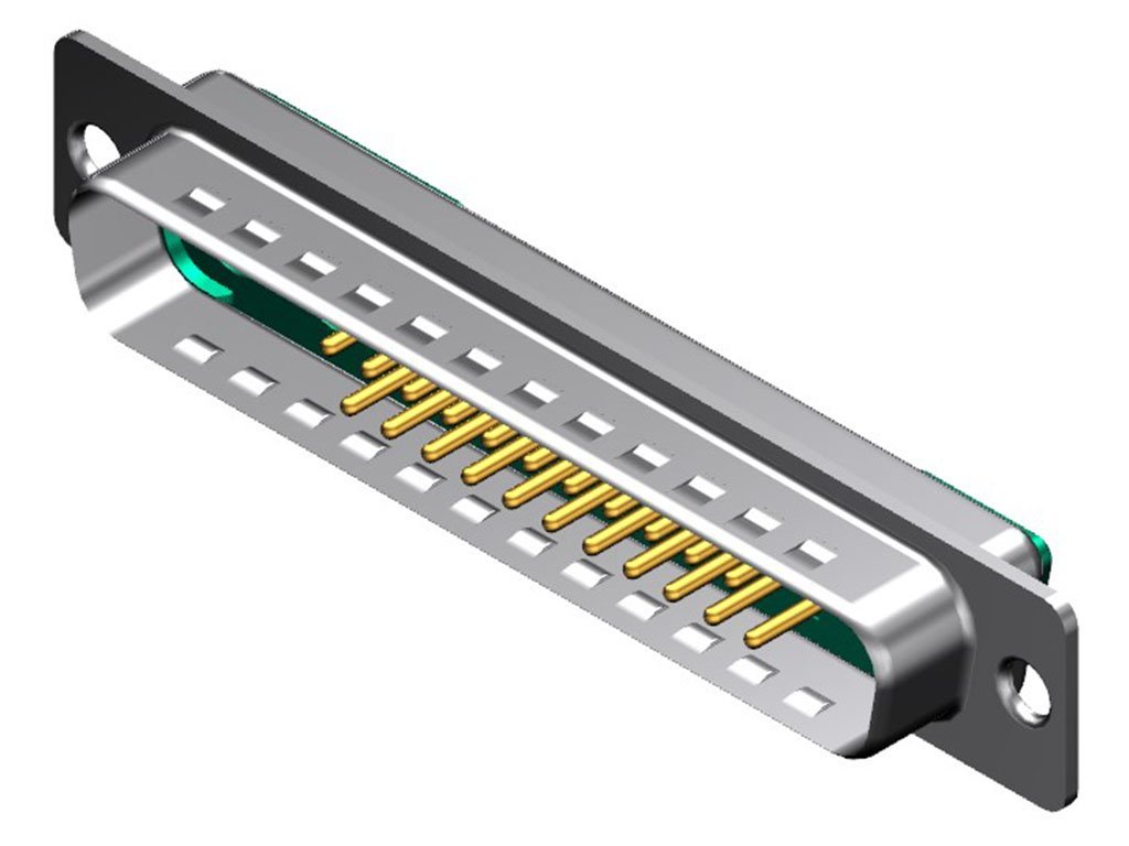 FCT Mixed Layout D-Sub Connector, Male, Straight, Solder Cup, Gold Plating, Tin-plated Shell with Dimples, 25 Circuits Max, 22 Signal Contacts Loaded, Green Insulator