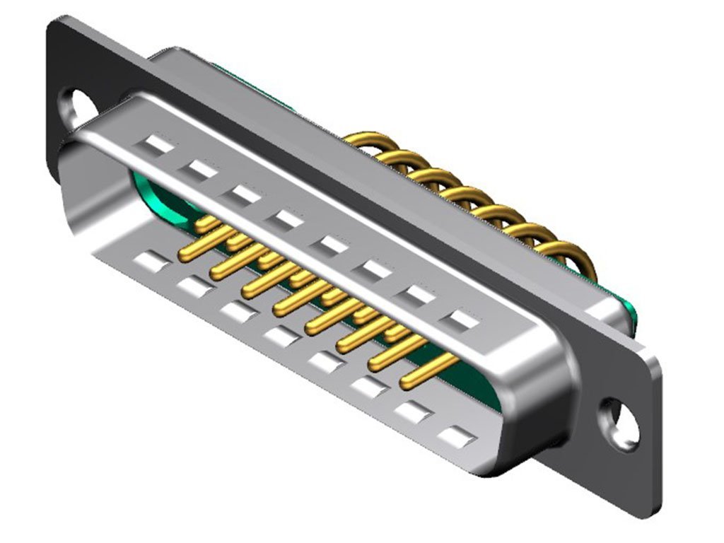 FCT Mixed Layout D-Sub Connector, Male, Right-Angle, PCB Through Hole, Gold Plating, Tin-plated Shell with Dimples, 17 Circuits Max, 15 Signal Contacts Loaded, Green Insulator