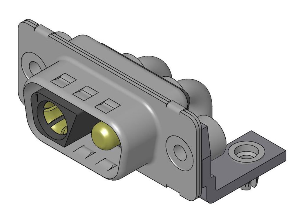 FCT Mixed Layout D-Sub Connector, Male, Right-Angle, PCB Through Hole, Gold Plating, Tin-plated Shell with Dimples, Polarized, 14.50mm Riveted Metal Bracket and #4-40 Clinch Nut, 2 Circuits Loaded (High Power Male and Female), Black Insulator