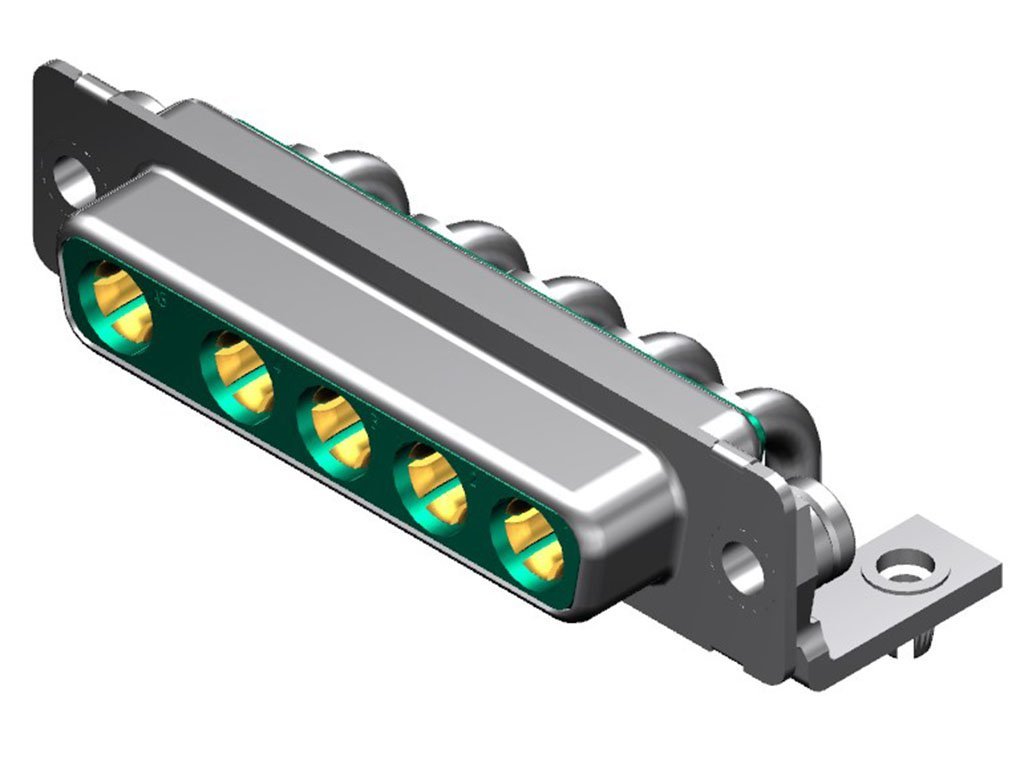 FCT Mixed Layout D-Sub Connector, Female, Right-Angle, PCB Through Hole, Gold Plating, Tin-plated Shell, 14.50mm Riveted Metal Bracket and M3 Clinch Nut, 5 Circuits Loaded (High Power), Green Insulator