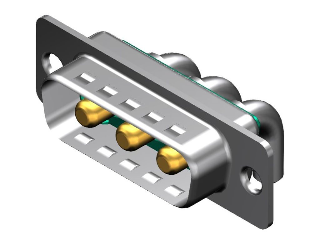 FCT Mixed Layout D-Sub Connector, Male, Right-Angle, PCB Through Hole, Gold Plating, 11.00mm Tail Length, Tin-plated Shell with Dimples, 3 Circuits Loaded (High Power), Green Insulator