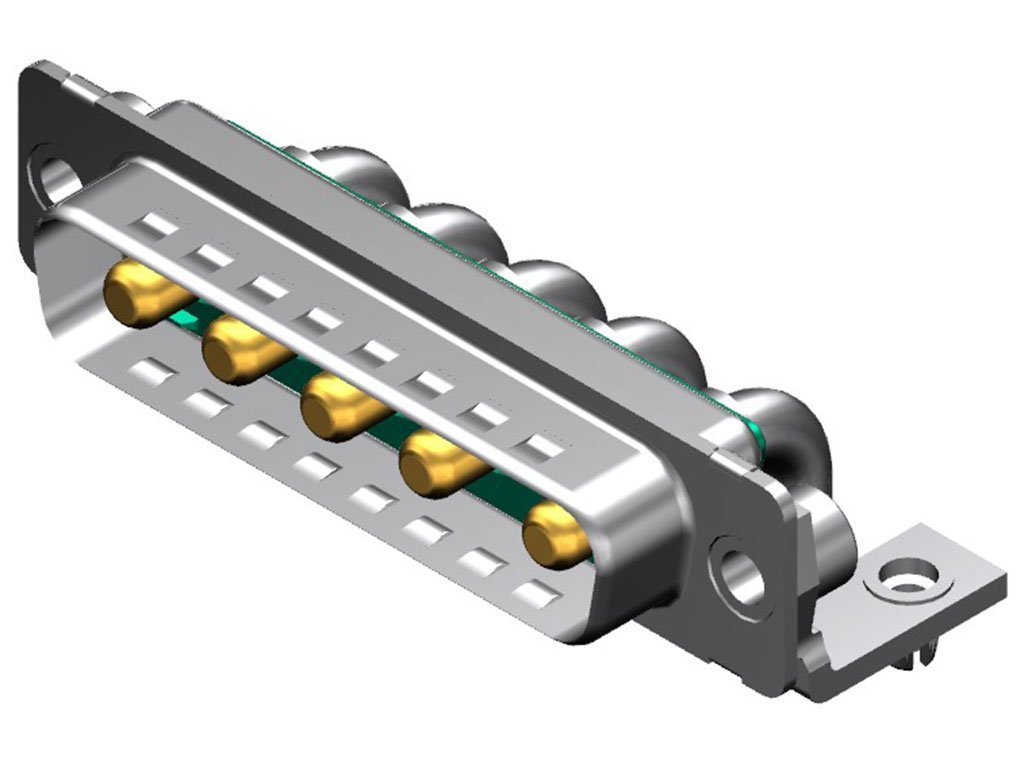 FCT Mixed Layout D-Sub Connector, Male, Right-Angle, PCB Through Hole, Gold Plating, 3.75mm Diameter Contacts, Tin-plated Shell with Dimples, 14.50mm Riveted Metal Bracket and #4-40 Clinch Nut, 5 Circuits Loaded (High Power), Green Insulator