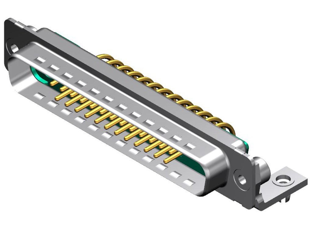 FCT Mixed Layout D-Sub Connector, Male, Right-Angle, PCB Through Hole, Gold Plating, Tin-plated Shell with Dimples, 14.50mm Riveted Metal Bracket and #4-40 Clinch Nut, 27 Circuits Max, 25 Signal Contacts Loaded, Green Insulator