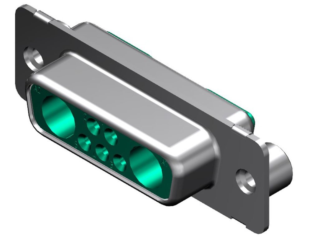 FCT Mixed Layout D-Sub Connector, Female, Straight, Solder Cup, Gold Plating, Tin-plated Shell, #4-40 Self-Locking Clinch Nut, 7 Circuits Max, 5 Signal Contacts Loaded, Green Insulator