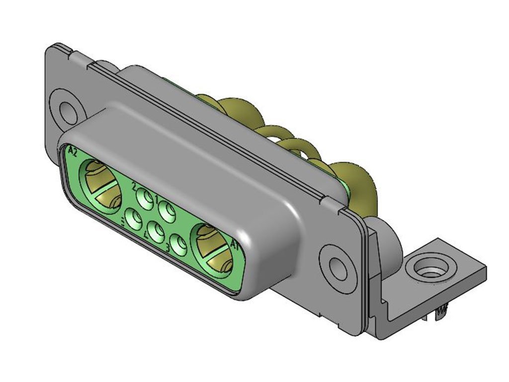 FCT Mixed Layout D-Sub Connector, Female, Right-Angle, PCB Through Hole, Gold Plating, Tin-plated Shell, 14.50mm Riveted Metal Bracket and #4-40 Clinch Nut, 9 Circuits Loaded (4 High Power, 5 Signal), Green Insulator