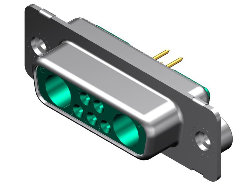 FCT Mixed Layout D-Sub Connector, Female, Straight, PCB Through Hole, Gold Plating, Tin-plated Shell, #4-40 Clinch Nut, 7 Circuits Max, 5 Signal Contacts Loaded, Green Insulator