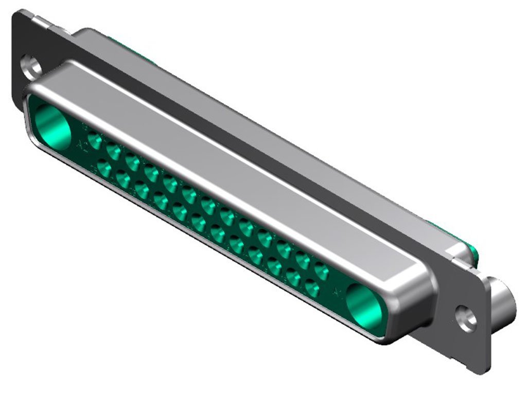 FCT Mixed Layout D-Sub Connector, Female, Straight, Solder Cup, Gold Plating, Tin-plated Shell, #4-40 Self-Locking Clinch Nut, 27 Circuits Max, 25 Signal Contacts Loaded, Green Insulator