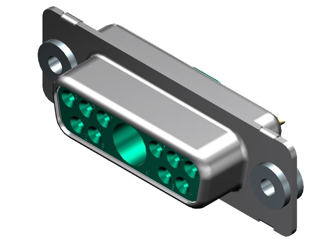 FCT Mixed Layout D-Sub Connector, Female, Straight, Solder Cup, Gold Plating, Tin-plated Shell, Float Mount, 11 Circuits Max, 10 Signal Contacts Loaded, Green Insulator