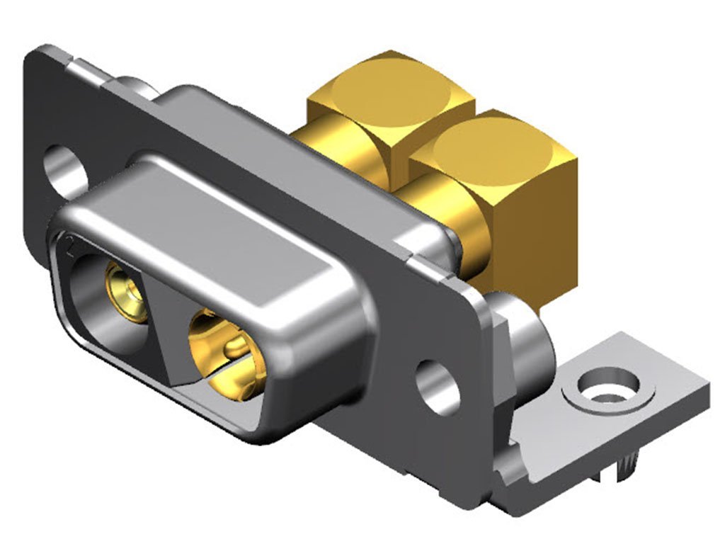FCT Mixed Layout D-Sub Connector, Female, Right-Angle, PCB Through Hole, Gold Plating, Tin-plated Shell, Polarized, 14.50mm Riveted Metal Bracket and #4-40 Clinch Nut, 2 Circuits Loaded (Coaxial Male and Female), Black Insulator