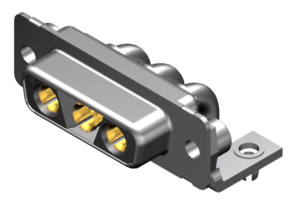 FCT Mixed Layout D-Sub Connector, Female, Right-Angle, PCB Through Hole, Gold Plating, Tin-plated Shell, Polarized, 14.50mm Riveted Metal Bracket and #4-40 Clinch Nut, 3 Circuits Loaded (High Power), Black Insulator