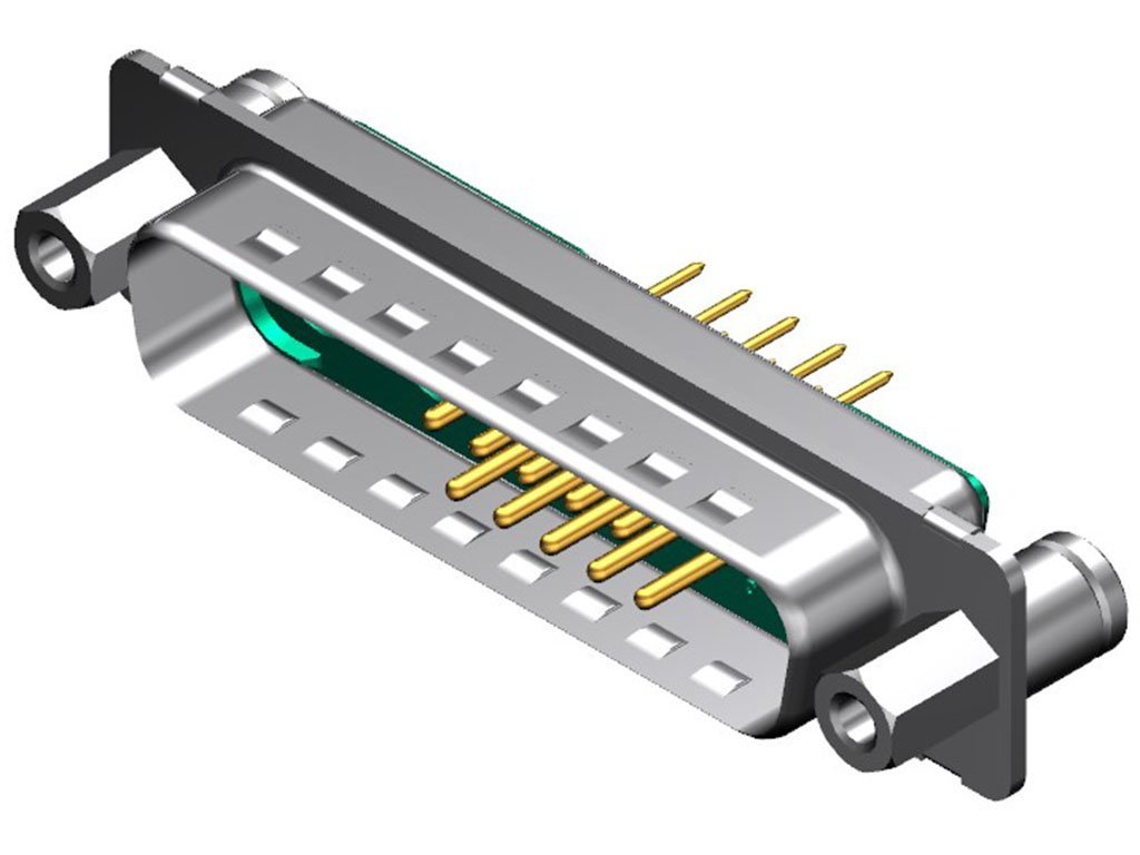 FCT Mixed Layout D-Sub Connector, Male, Straight, PCB Through Hole, Gold Plating, Tin-plated Shell with Dimples, 6.30mm #4-40 Front Threaded Spacer, 6.50mm M3 Rear Threaded Spacer, 13 Circuits Max, 10 Signal Contacts Loaded, Green Insulator