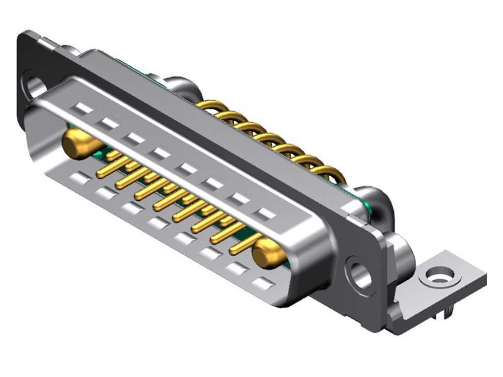FCT Mixed Layout D-Sub Connector, Male, Right-Angle, PCB Through Hole, Gold Plating, Tin-plated Shell with Dimples, 14.50mm Riveted Metal Bracket and #4-40 Clinch Nut, 17 Circuits Loaded (2 High Power, 15 Signal), Green Insulator