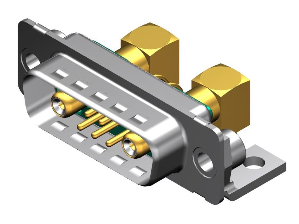 FCT Mixed Layout D-Sub Connector, Male, Right-Angle, PCB Through Hole, Gold Plating, Tin-plated Shell with Dimples, 11.90mm Metal Bracket and #4-40 Clinch Nut, 7 Circuits Loaded (2 Coaxial, 5 Signal), Green Insulator