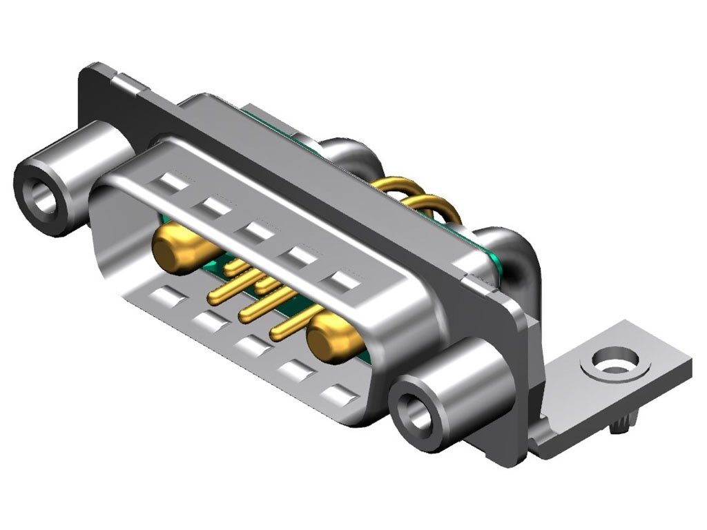 FCT Mixed Layout D-Sub Connector, Male, Right-Angle, PCB Through Hole, Gold Plating, Tin-plated Shell with Dimples, 14.50mm Riveted Metal Bracket, 6.00mm #4-40 Threaded Spacer, 7 Circuits Loaded (2 High Power, 5 Signal), Green Insulator