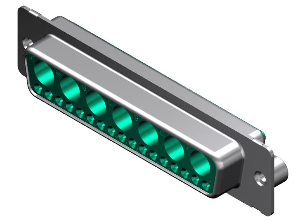 FCT Mixed Layout D-Sub Connector, Female, Straight, Solder Cup, Gold Plating, Tin-plated Shell, #4-40 Self-Locking Clinch Nut, 24 Circuits Max, 17 Signal Contacts Loaded, Green Insulator