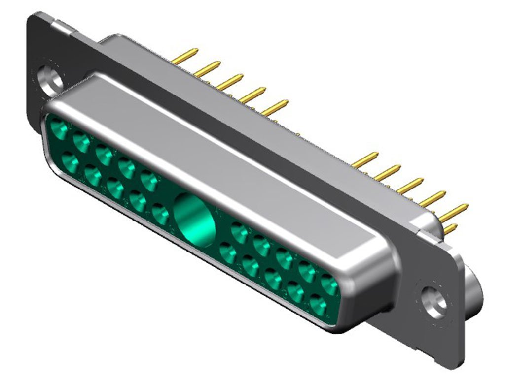 FCT Mixed Layout D-Sub Connector, Female, Straight, PCB Through Hole, Gold Plating, Tin-plated Shell, #4-40 Clinch Nut, 21 Circuits Max, 20 Signal Contacts Loaded, Green Insulator