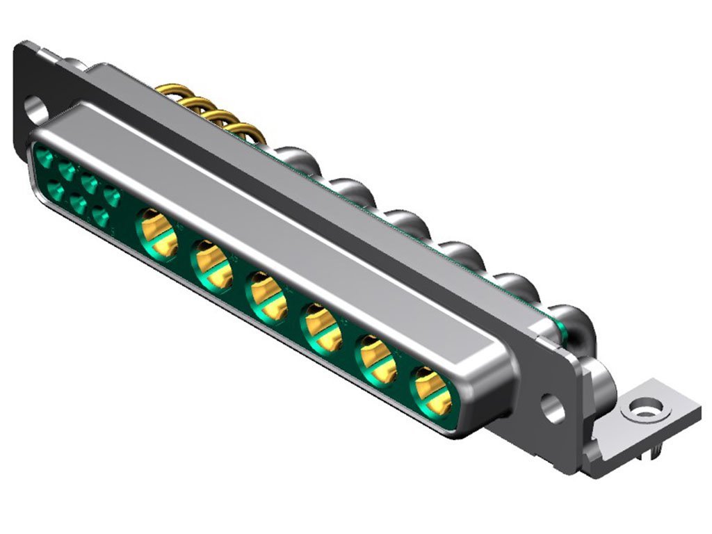 FCT Mixed Layout D-Sub Connector, Female, Right-Angle, PCB Through Hole, Gold Plating, Tin-plated Shell, 14.50mm Riveted Metal Bracket and #4-40 Clinch Nut, 13 Circuits Loaded (6 High Power, 7 Signal), Green Insulator